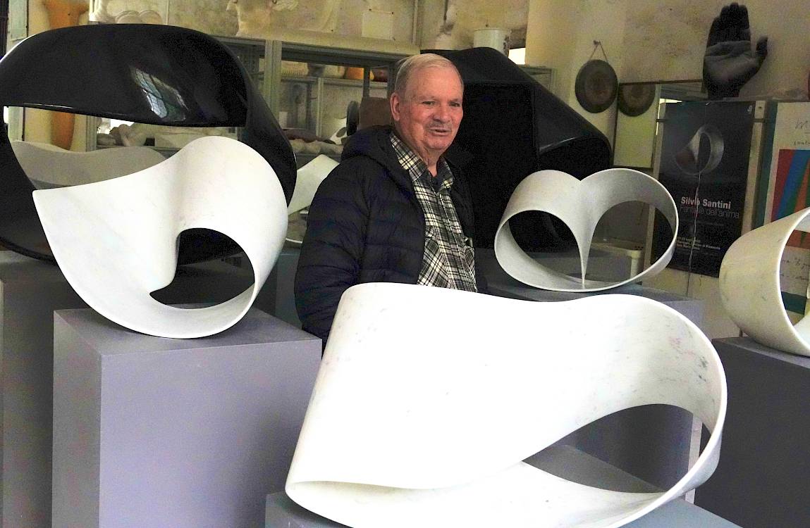 Erstmals werden mehr als 30 Skulpturen aus über fünf Jahrzehnten des künstlerischen Schaffens von Silvio Santini in einer einzigen Ausstellung gezeigt. Sein Lebenswerk als Steinmetz, Unternehmer und Kunstschaffender wird im Kontext zu Carrara mit seinem Marmor und seinen Steinbrüchen gezeigt.